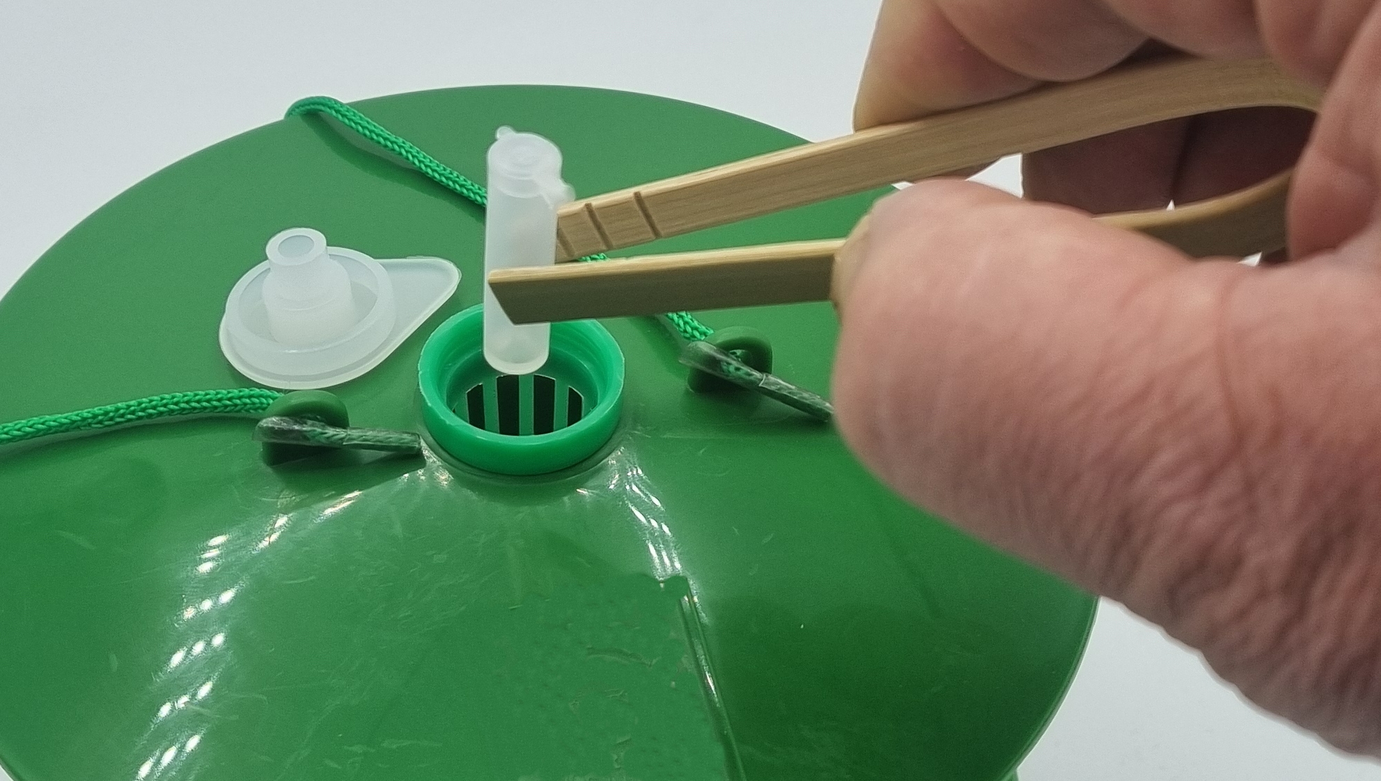 La phéromone se place dans le petit panier ajouré en haut du piège.