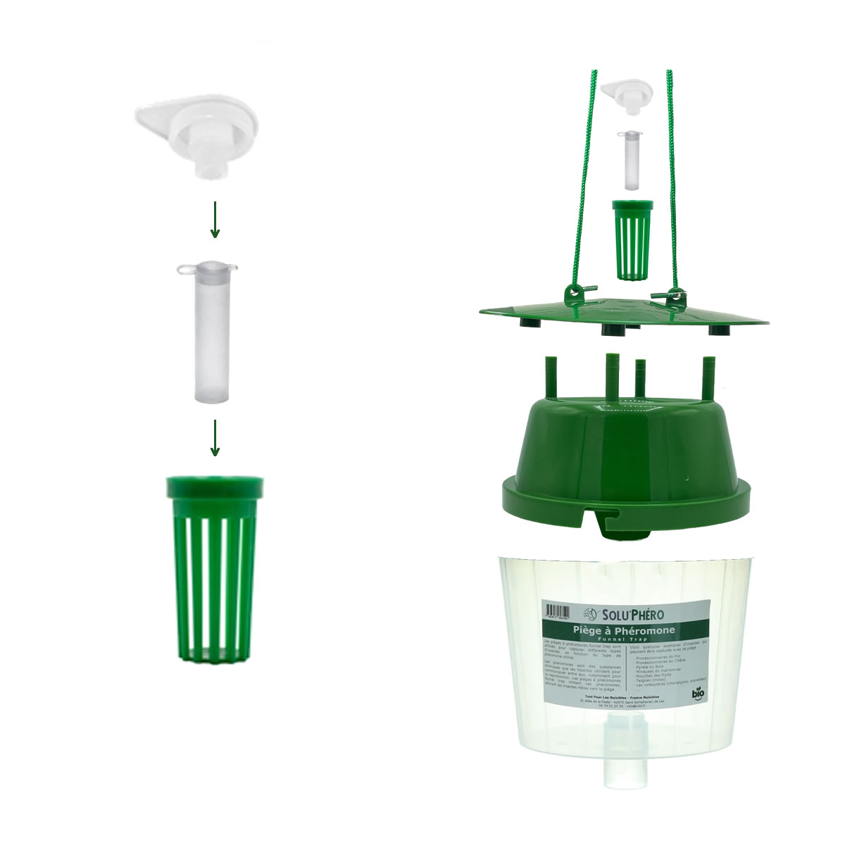 Le piège funnel trap s’utilise avec une capsule à phéromone spécifique pour chaque nuisibles. Les phéromones sont des substances chimiques volatiles, naturellement émises par un insecte pour attirer les mâles lors de la reproduction.